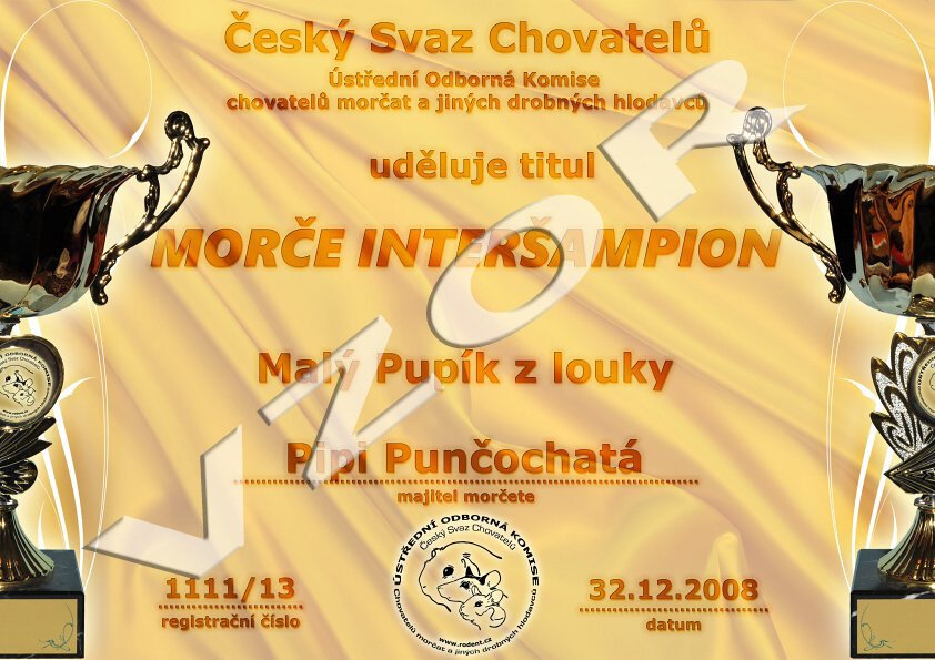 Morče Interšampion - je zapotřebí nejméně 5 kartiček, přičemž nejméně 3 musí být ze zahraniční výstavy, od nejméně 2 různých posuzovatelů