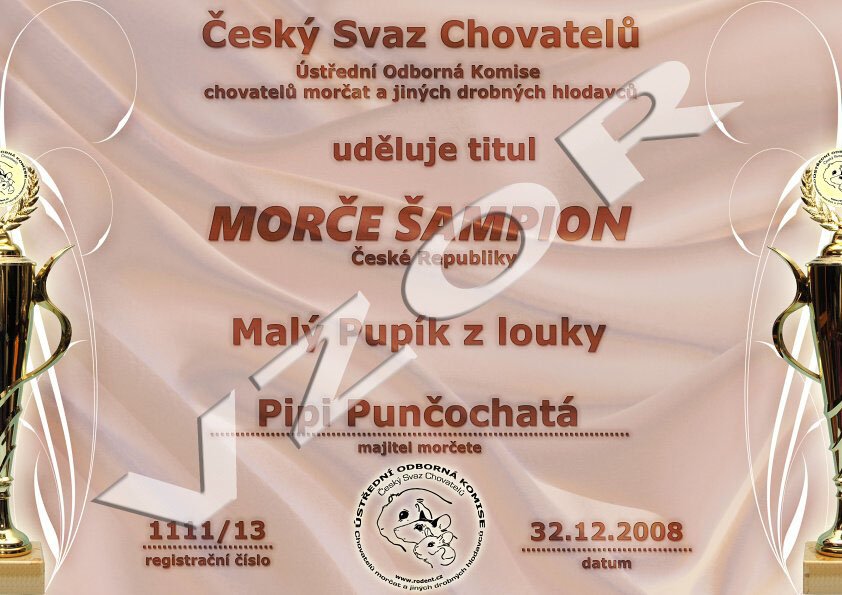 Morče Šampion České republiky - je zapotřebí nejméně 5 kartiček "morče čekatel", nejméně 3 kartičky musí být z výstavy pořádané v ČR a kartičky musí být nejméně od 2 různých posuzovatelů